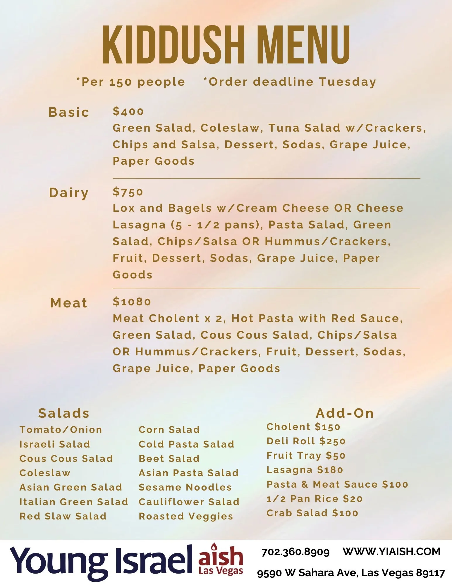 Catalog › Kiddush Kiddush from $400.00 Please include your “In memory/honor of” message for the newsletter at checkout under “Additional Information”. Please include your “In memory/honor of” message for the newsletter at checkout under “Additional Information”. Package: Select Package Basic Dairy Meat Quantity: Add to Cart Added!