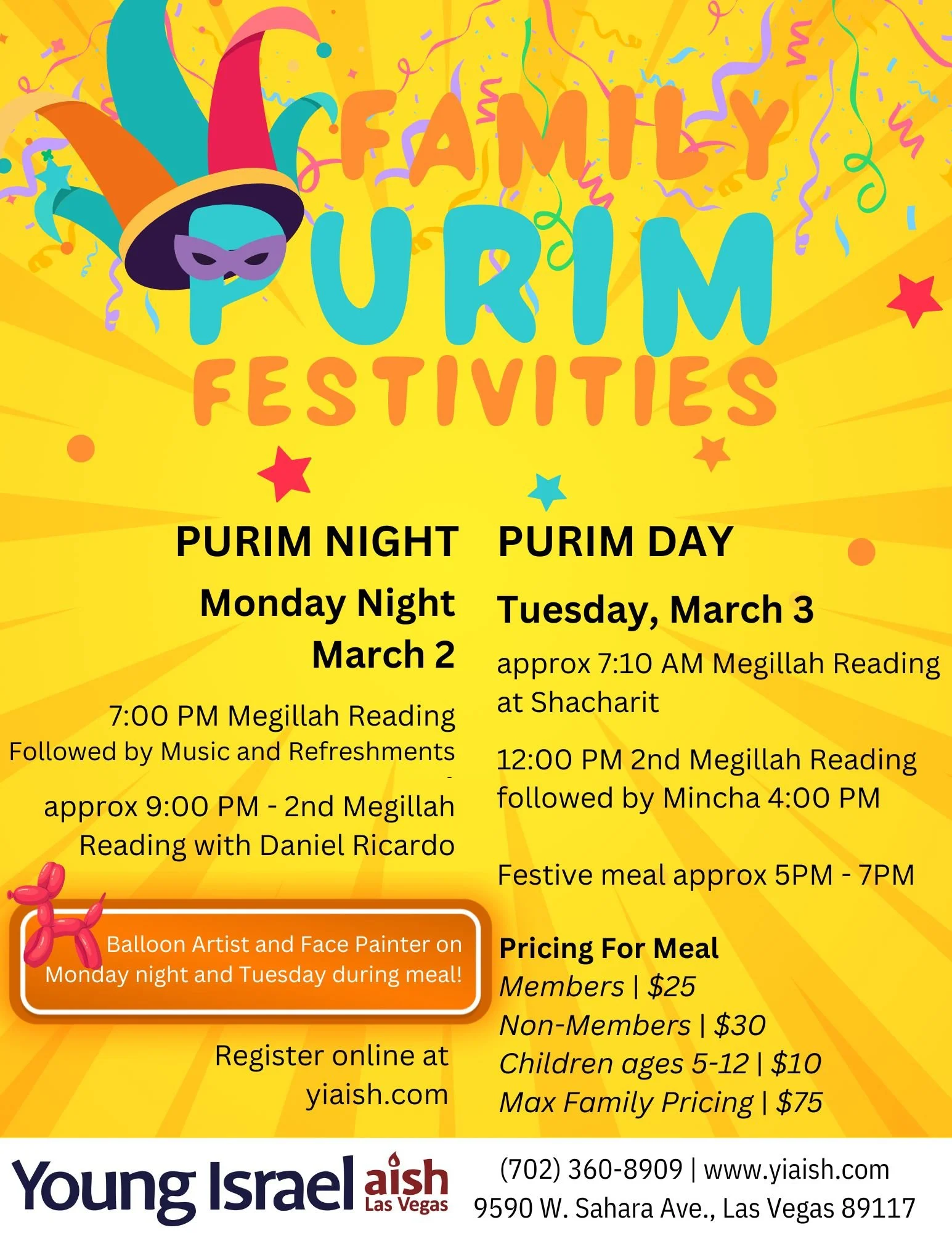 RSVP Purim Seudah from $10.00 Tickets: Select Tickets Children ages 5-12 ($10) Members ($25) Non-Members ($30) Max Family ($75) Add to cart